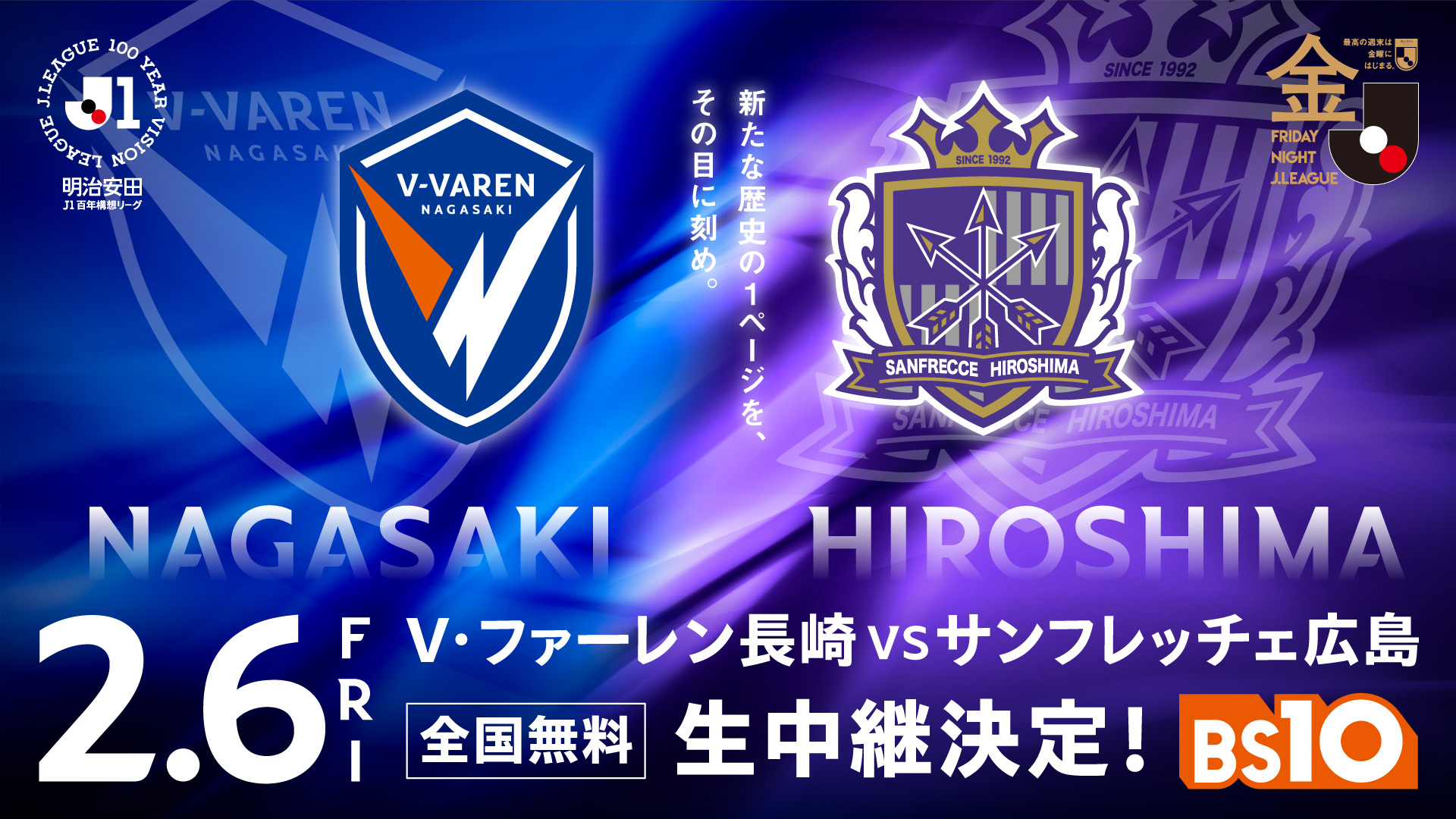 - 明治安田J1百年構想リーグ 地域リーグラウンド WEST 第1節 2/6(金)「V・ファーレン長崎 vs サンフレッチェ広島」両クラブで8年ぶりの 『PEACE MATCH』 をBS10で全国無料生中継!