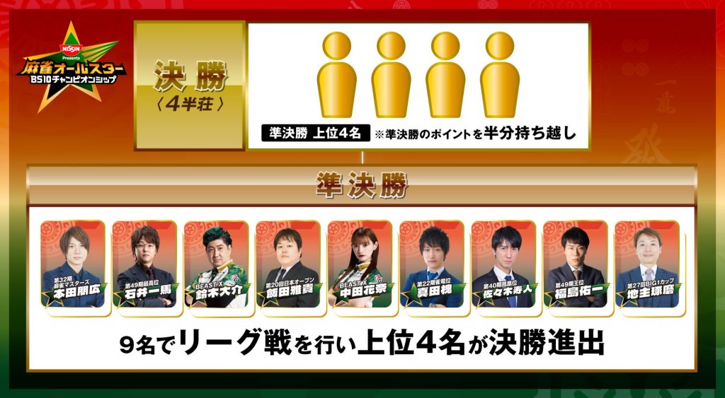 現Mリーガーと5名と、各団体のプロ雀士4名によって行われる準決勝。
