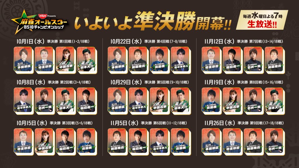 毎週水曜よる7時から生放送中の『日清食品Presents 麻雀オールスター BS10チャンピオンシップ』。 国内主要大会のタイトルホルダーや麻雀プロ団体のスター選手が集い、国内個人タイトル戦として最高額となる賞金総額1,000万円をかけて戦うこの大会では、10月1日(水)より準決勝が始まります。これまで各予選ブロックを勝ち抜いた8名と、敗者復活戦で勝利した1名を合わせた計9名でのリーグ戦となります。