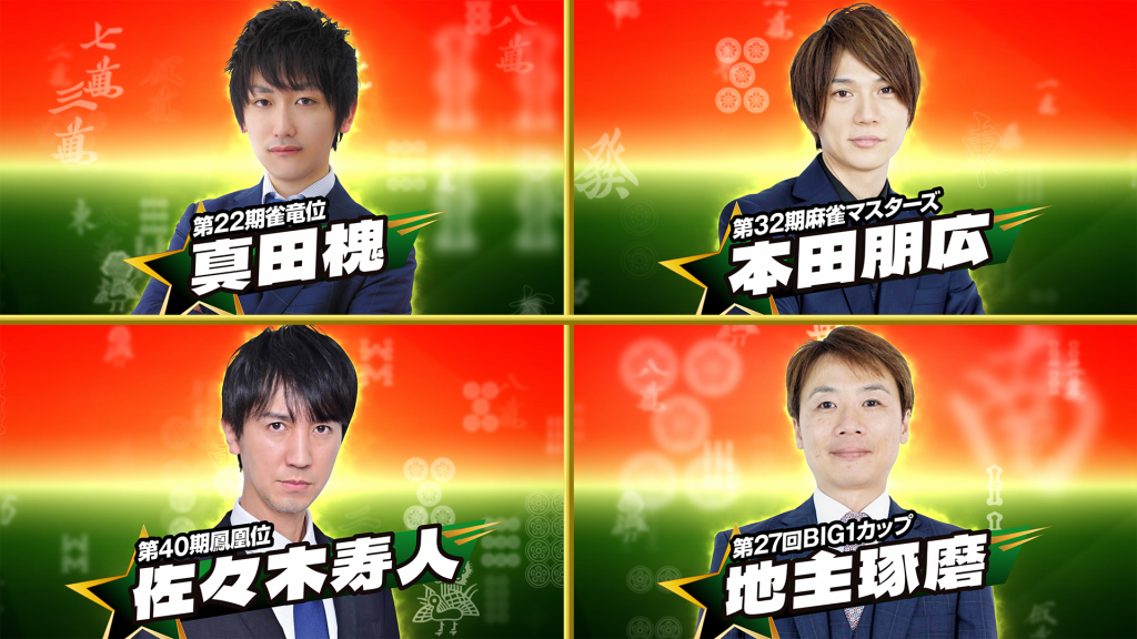 各プロ団体のタイトルホルダー、Mリーガー、著名人雀士の32名から勝ち残ったのは、第22期雀竜位・真田槐、第32期 麻雀マスターズ・本田朋広(TEAM雷電)、第40期鳳凰位・佐々木寿人(KONAMI麻雀格闘倶楽部)、第27回BIG1カップ・地主琢磨の4名。決勝戦では、準決勝のポイントを半分持ち越し、4半荘終了時のトップが優勝となります。