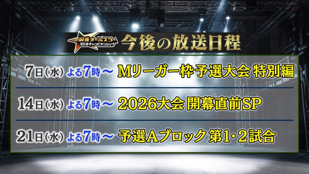 1月7日(水)よる7:00からはMリーガー枠予選大会の特別編を放送。さらに、14日(水)は開幕1週間前ということで各予選ブロックに出場する選手を発表し、組み合わせの抽選を行います。そして、21日(水)からは予選Aブロック開幕となります。