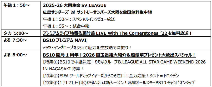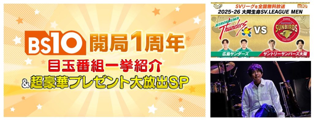 2025年1月10日(金)に開局した全国無料のBS放送局「BS10(ビーエステン)」は、明日2026年1月10日(土)に開局1周年を迎えます。この大きな節目を記念し、当日は1年間の感謝を込めた1日を通してお楽しみいただける特別編成を放送することが決定いたしました。超豪華プレゼントが当たるBS10開局1周年の特番や、両チームともに日本代表選手が所属するプロ男子バレー大同生命SV.LEAGUE 広島サンダース 対 サントリーサンバーズ大阪戦の生中継、佐藤竹善のプレミアムライブ、ミッツ・マングローブとともに深堀するBS10プレミアムNAVIなど盛りだくさんでお届けいたします。